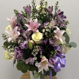 Price: $90.95 Pink and Red Roses, Mini Daisies, Lilies, in a Purse Arrangement with Chocolates Product Tags: Same-day Delivery
